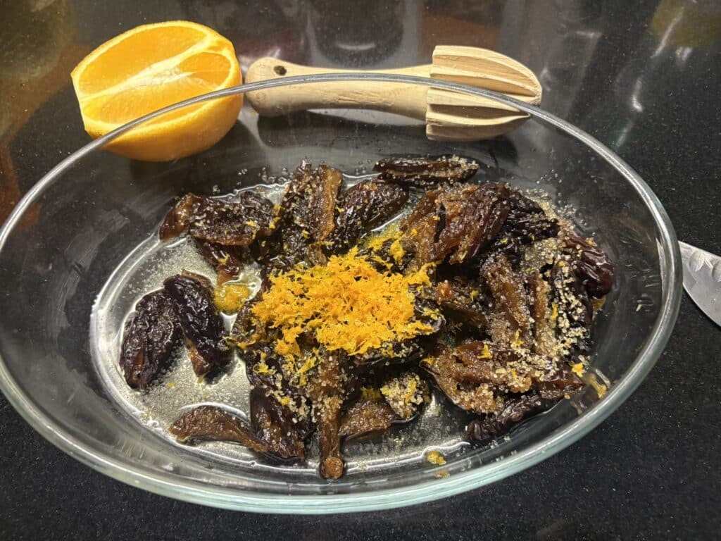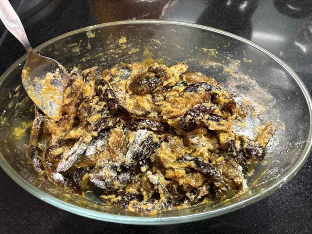 Dans le plat ayant servi à la macération, ajoutez le zeste d’orange puis saupoudrez les pruneaux de 2 cuillères à soupe de farine. En les enrobant ainsi — comme les noix — vous évitez qu’ils ne tombent au fond du moule pendant la cuisson. Réserver.