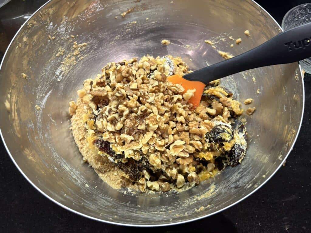 Ajoutez les pruneaux et les noix concassées, puis mélangez délicatement à la maryse. Versez ensuite la pâte dans le ou les moules.